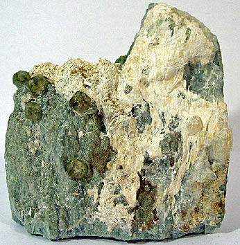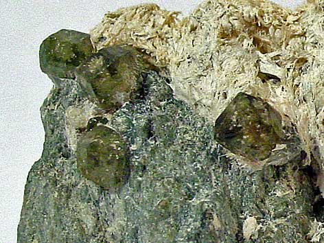 Nr. M544 Andradit als grüne Demantoide (ca. 5 mm Größe), neben Chrysotilasbest, auf Serpentinit Asbestgruben von Sferlun, Val Malenco, Sondrio Provinz, Lombardei, Italien; Funddatum: 1999 Größe Stufe: ca. 6 x 5,5 cm; 30 € |