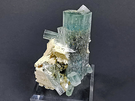 Aquamarin-Kristall neben Muskovit auf Albit Stak Nala, Nanga Parbat-Haramosh-Berge, Skardu, Gilgit-Baltistan, Pakistan Stufe: 7,5 x 4,7 cm
