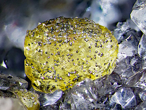 Baryt-Kristall mit kleinen Pyrit xx auf Calcit xx Detail der links abgebildeten Stufe Bildbreite: 9 mm