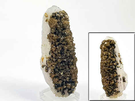 Siderit xx neben Pyrit auf Quarzkristall Bergwerk Drosen, Ronneburger Uranbergbaurevier, Thüringen, BRD Stufe: 5,7 x 2,3 cm