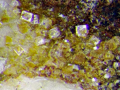 kubisches Kristallsystem; farblos bis gelb; transparente, auch sich durchdringende Würfel bis zu mehreren Millimetern Durchmesser, in der aber Regel <0,1 mm groß. Die Kristalle können gestufte Wachstumsmerkmale aufweisen. |