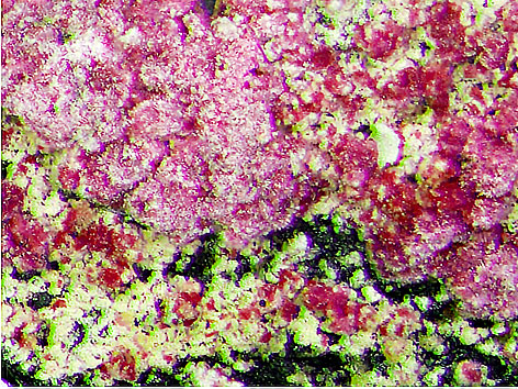 ![]() Bieberit xx und Moorhouseit neben Kobaltkoritnigit xx Detail der oben links abgebildeten Stufe Bildbreite: 2,5 mm