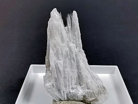monoklines Kristallsystem; farblos, weiß; nadelige Kristalle (Kohnstein) und kristallin oder faserig als Adern in Tonschichten (Tuzla). |