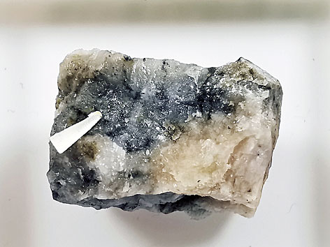 ![]() Aurostibit, silberweiß (im Zentrum des Fotos), neben Quarz u. a. Krásná Hora nad Vltavou, Bezirk Příbram, Mittelböhmische Region, Tschechische Republik Bildbreite: 2,5 mm