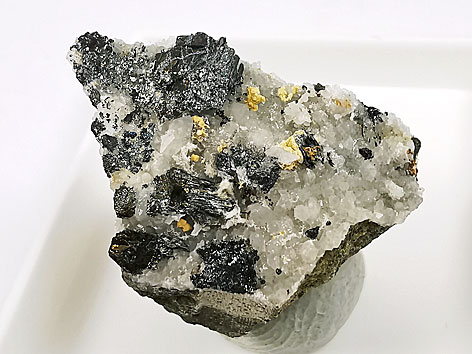 kleine Betechtinit xx neben Chalkopyrit, Bornit u.a. mit und auf Calcit und Kupferschiefer Otto-Brosowsky-Schacht, Gerbstedt, Sa.-Anhalt, BRD Bildbreite: 6,5 cm