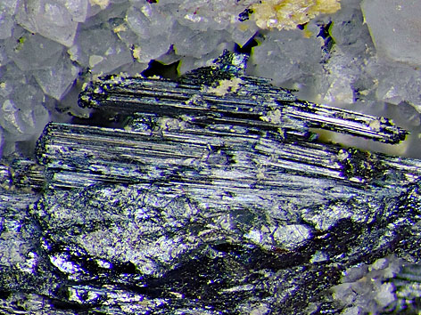 orthorhombisches Kristallsystem; graubraun bis eisenschwarz metallisch, oft braun angelaufen; Metallglanz; nadelförmige bis stengelige xx oft mit Riefung parallel der Längsachse bis 2 cm Länge, auch in Form unregelmäßiger Massen. |
