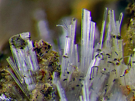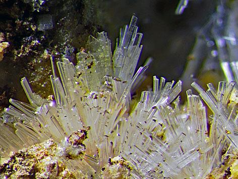 monoklines Kristallsystem; Dimorph von Baricit; farblos, weiß, blassblau bis bläulichweißgrau; radialblättrige Kristallaggregate, subparallel und fächerförmig verwachsen aus abgeflachten, in der Spitze keilförmig zulaufenden, gestreckten Kristallen; wirrstrahlig; Sphärolithe; Rosetten; Kristallgrößen in cm seien auch bekannt. |