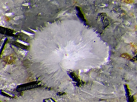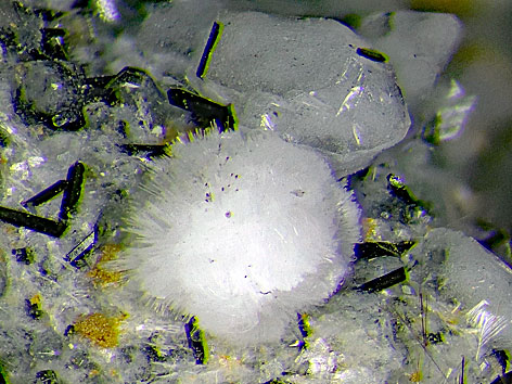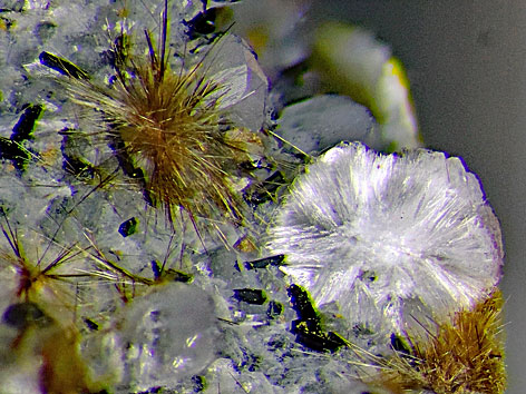 Ellingsenit xx neben Natrolith und Aegirin Detail der links abgebildeten Stufe Bildbreite: 3,5 mm