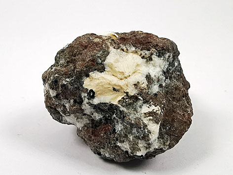 tetragonales Kristallsystem; farblos, weiß. Garronit-Ca bildet strahlige Aggregate bis etwa 2 cm Größe, die Hohlräume im Gestein füllen. Selten sind dipyramidale, undeutliche Kristalle. |