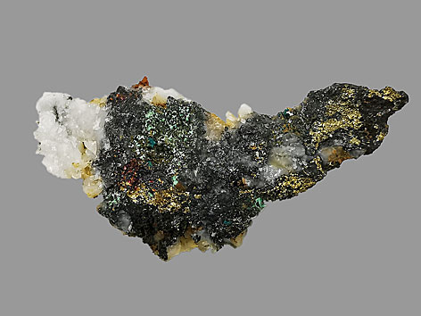 ![]() Redgillit xx auf Chalkopyrit und neben Quarz u. a. Grube Schöne Aussicht, Dernbach, Westerwald, Rheinland-Pfalz, BRD Stufe: 2,3 x 1,0 cm