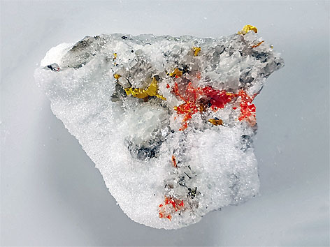 Tochilinit xx auf Auripigment neben Realgar und Trechmannit auf Dolomit Grube Lengenbach, Binntal, Wallis, Schweiz Stufe: 18 x 15 mm