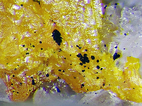 Tochilinit xx (schwarz) auf Auripigment Detail der links abgebildeten Stufe Bildbreite: 1,8 mm