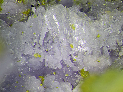monoklines Kristallsystem; blassrosa mit violettem Schimmer, farblos; oft gestreckte Kristalle oder auch körnig. |